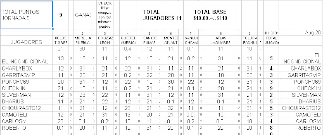 ganador fecha 5 : CHECO , 9 PTS $110.00