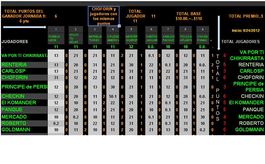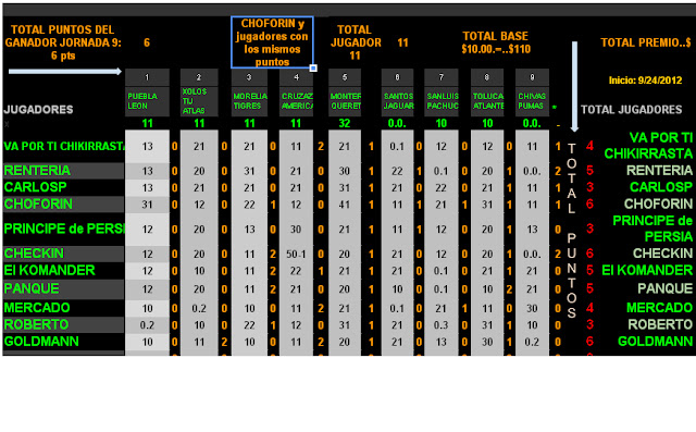 Ganador fecha 9 hubo triple empate Choforin , Checking, Goldmann con 6 pts de la liga mx