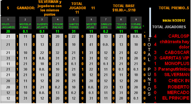 Ganadores fecha 7 : Triple empate Silverman $33.30, Checo $33.30, Roberto, $33.33 con 5 puntos c/u. Favor eviar agos pendientes pra poder entregar el premio.