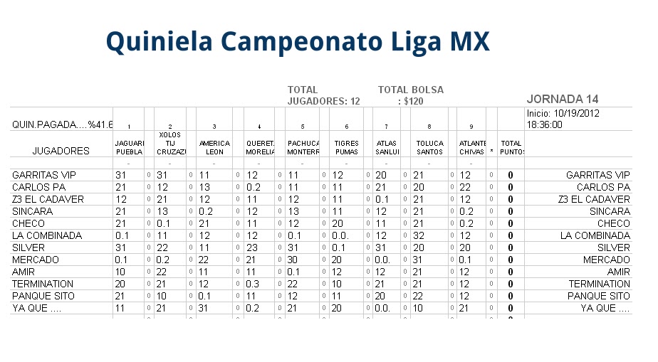 TCTORNEOS te invita a participar, adquiere tu MEMBRESIA! por solo $5.00 usd. por todo el torneo 2012 Participacion por jornada usd1.00 Requisitos: Contar con un email particular, una cuenta bancaria para deposito de tus ganancias, aceptar el reglamento de la sociedad, ser amateur, (no se aceptan profesionales) (consulta formas de pago y cobro) E-mail del $ Para ponerte en contacto con nosotros, escribenos al E-MAIL del DINERO: tctorneos@gmail.com Se hace la retencion del 5% del importe del premio para efectos de gasto de recuperacion de admon. y diseño sitio oficial. Visita la pagina de la FEMEXFUT checa los partidos en la pagina de la FEMEXFUT Consulta el calendario de juegos HAS click Aqui
