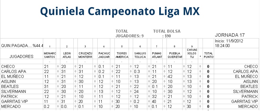 TCTORNEOS te invita a participar, adquiere tu MEMBRESIA! por solo $5.00 usd. por todo el torneo 2012 Participacion por jornada usd1.00 Requisitos: Contar con un email particular, una cuenta bancaria para deposito de tus ganancias, aceptar el reglamento de la sociedad, ser amateur, (no se aceptan profesionales) (consulta formas de pago y cobro) E-mail del $ Para ponerte en contacto con nosotros, escribenos al E-MAIL del DINERO: tctorneos@gmail.com Se hace la retencion del 5% del importe del premio para efectos de gasto de recuperacion de admon. y diseño sitio oficial. Visita la pagina de la FEMEXFUT checa los partidos en la pagina de la FEMEXFUT Consulta el calendario de juegos HAS click Aqui